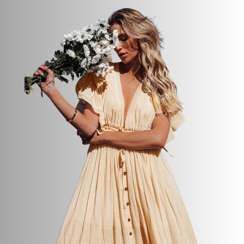 - Uno scollo a V lusinghiero che mette in risalto il décolleté e le spalle