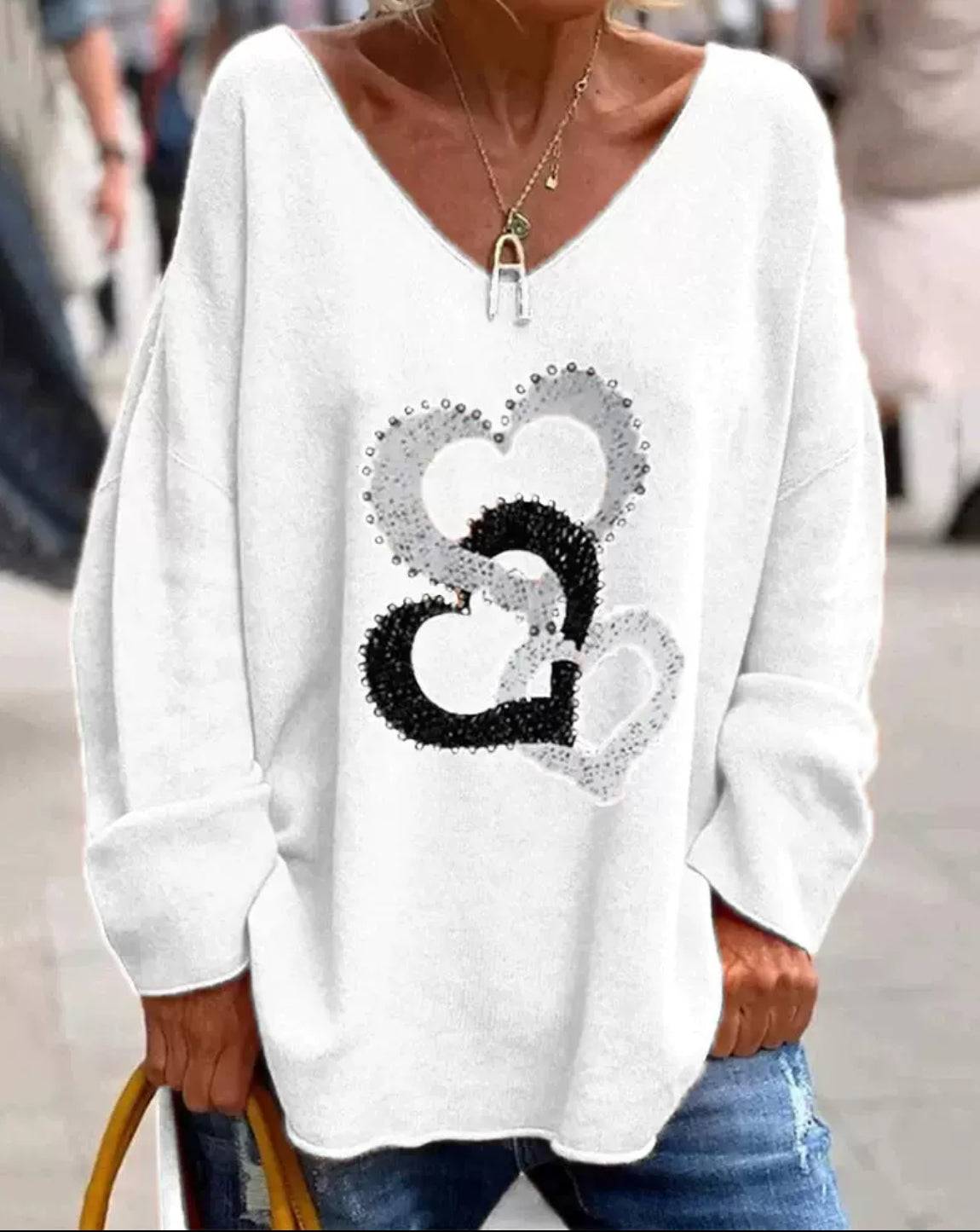 Maglione con scollo a V e stampa a cuore per uno stile disinvolto