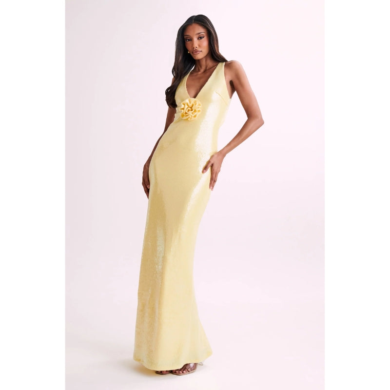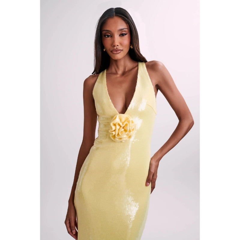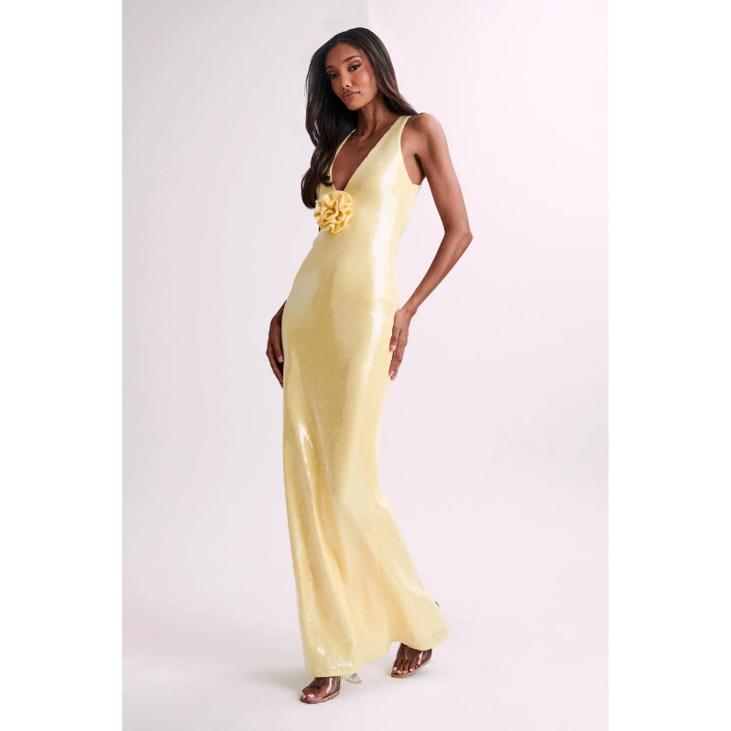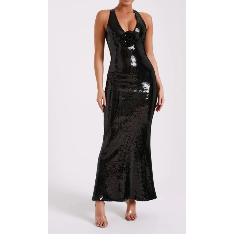 Questo abito presenta una profonda scollatura a V che incornicia magnificamente la parte superiore del corpo. La sua silhouette aderente esalta le curve naturali con un taglio elegante e fluido. Le paillettes ricoprono l'intero abito, creando un delicato luccichio che cattura la luce. Un dettaglio floreale vicino al seno aggiunge un tocco delicato e romantico.