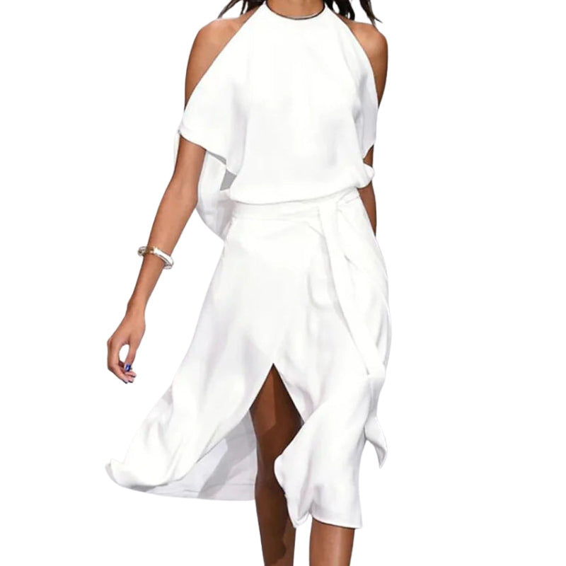 L'abito Aurelie presenta un design a spalle scoperte con scollatura all'americana e spacco laterale. Il tessuto leggero e fluido consente una grande libertà di movimento, mantenendo una silhouette moderna.