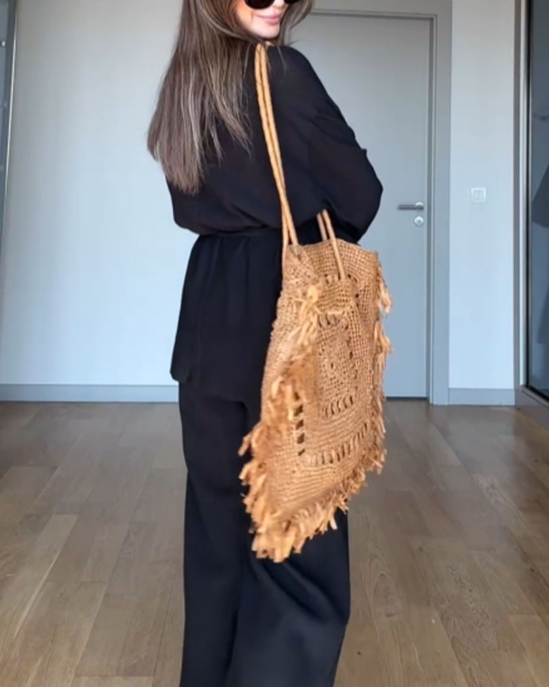 Questo completo due pezzi è composto da un top avvolgente con profondo scollo a V e maniche lunghe e fluide. Una cintura coordinata stringe la vita, offrendo una vestibilità valorizzante e personalizzabile. I pantaloni a gamba larga completano il look con una silhouette equilibrata ed elegante.