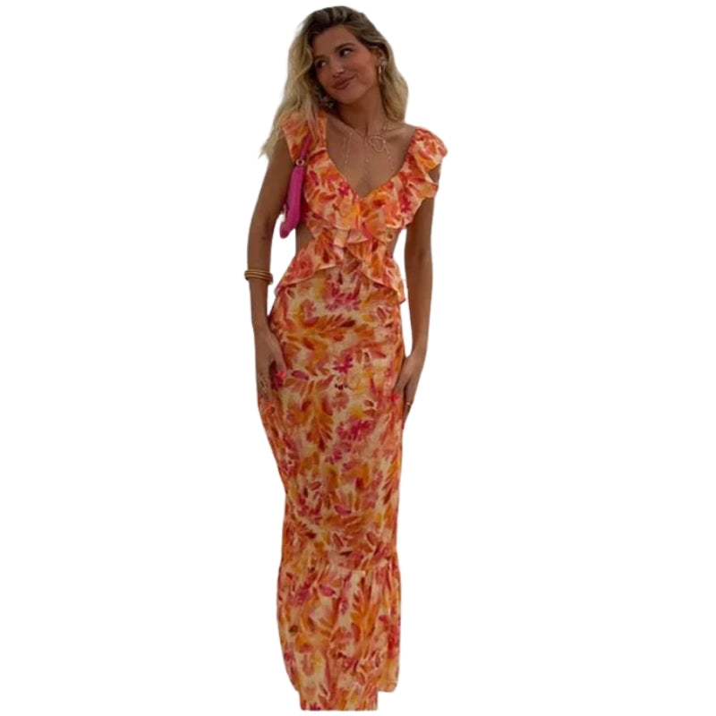 Il maxi abito Barbara presenta un design senza maniche, uno scollo a V e una stampa a fantasia per un look fresco ed elegante. Il suo taglio fluido consente movimenti aggraziati e naturali.