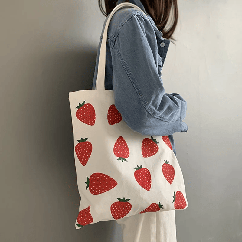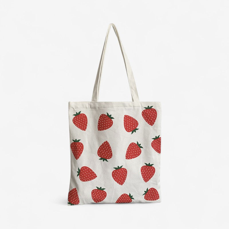 Ce sac fourre-tout présente une forme rectangulaire avec un imprimé fraise sur les panneaux. Il dispose d’un design pliable pour un rangement compact et de sangles pour l’épaule.