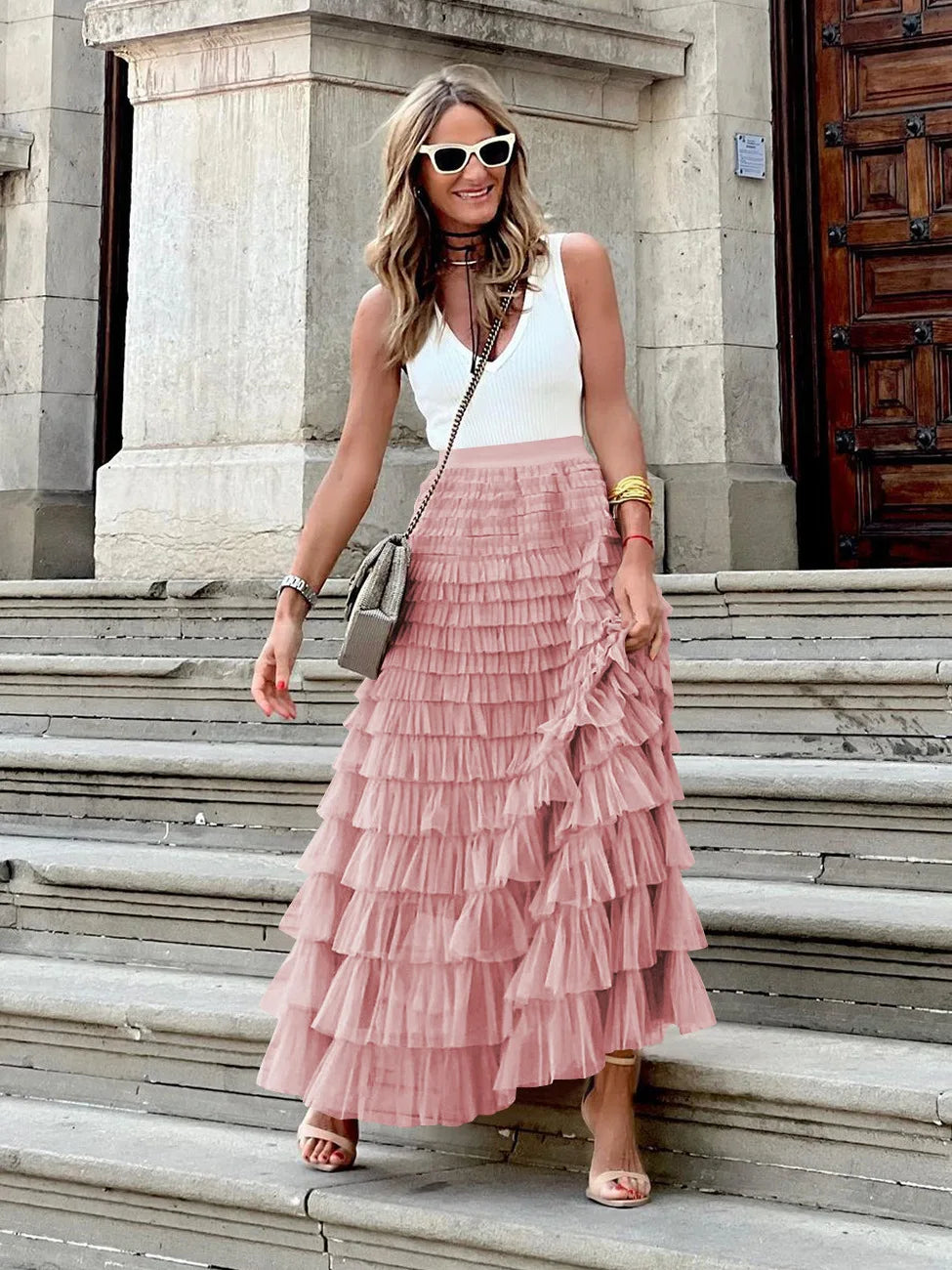 Arricchisci il tuo guardaroba con la maxi gonna in tulle Ella, un vero must-have per la prossima stagione. Il suo design elegante e unico la rende facile da abbinare a una varietà di top, offrendo infinite possibilità di outfit. Questa gonna non è solo un capo di stile, è un vero e proprio colpo d'occhio. Che tu stia esplorando la città o andando in ufficio, questa gonna garantisce un look chic e disinvolto.