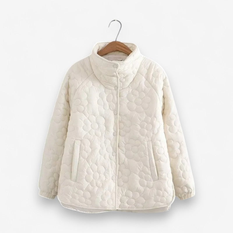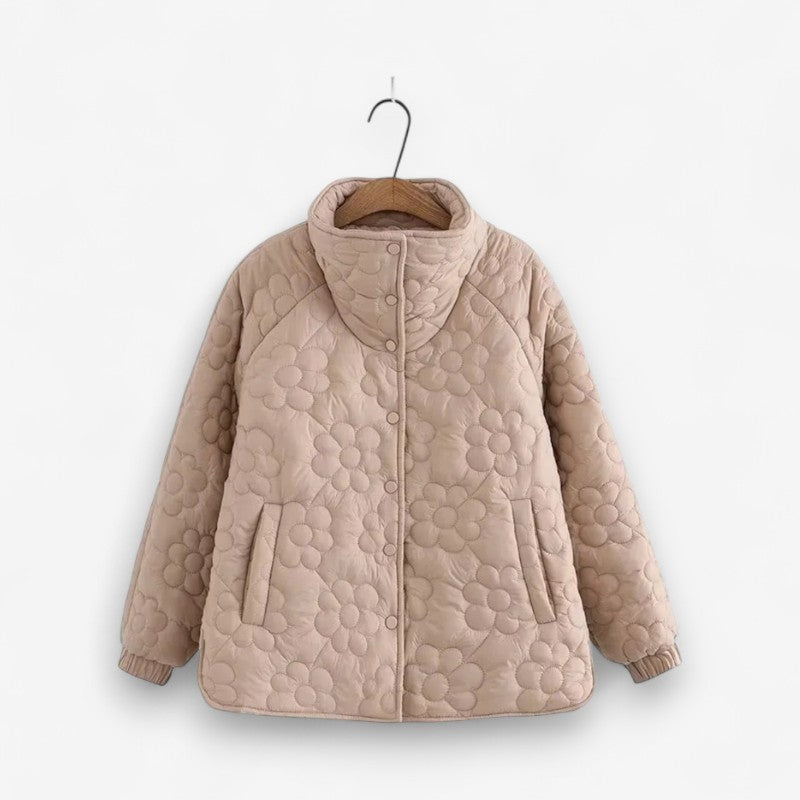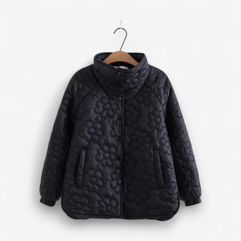 Ce manteau présente un col montant et des manches longues avec une coupe décontractée. Il comprend des poches avant et les panneaux ont une surface lisse.