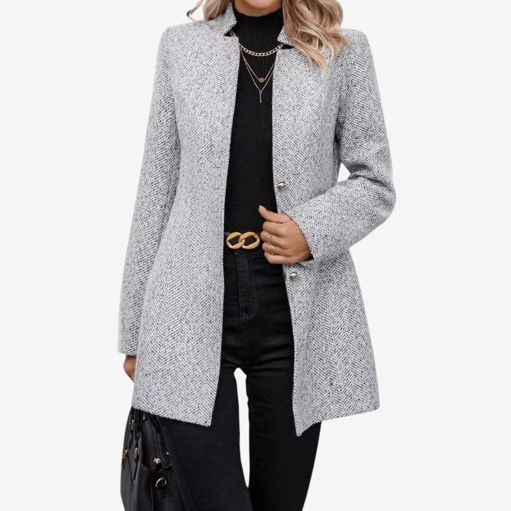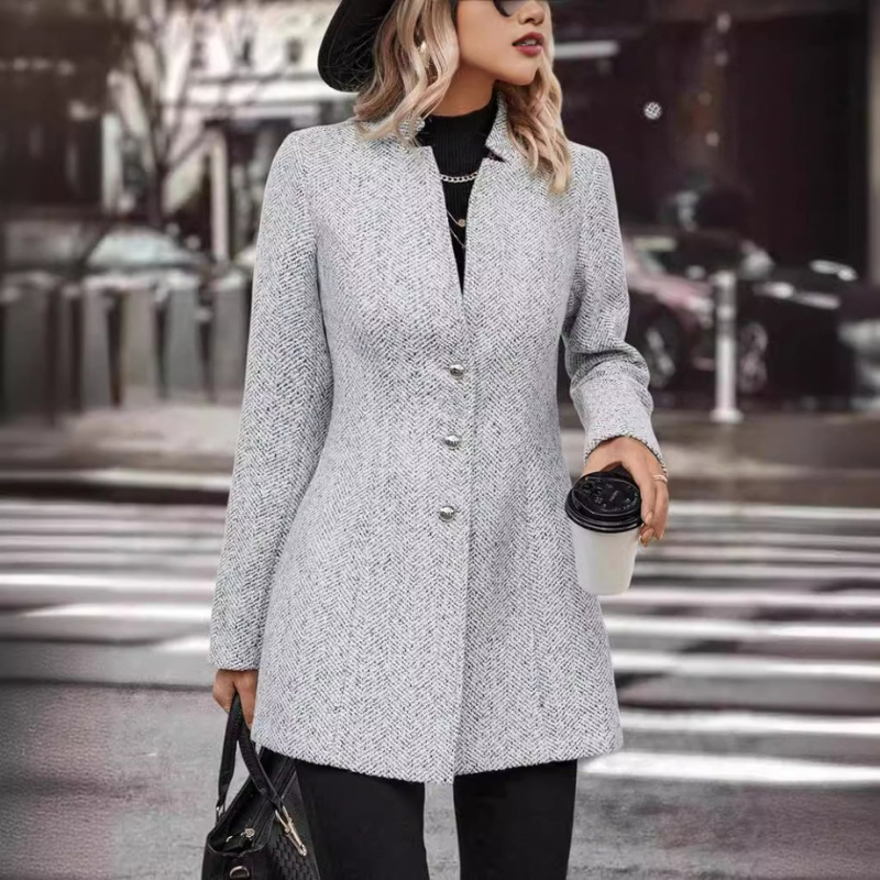 Ce manteau présente des manches longues et un col montant avec fermeture à boutons. Les panneaux ont une finition lisse avec des coutures régulières.