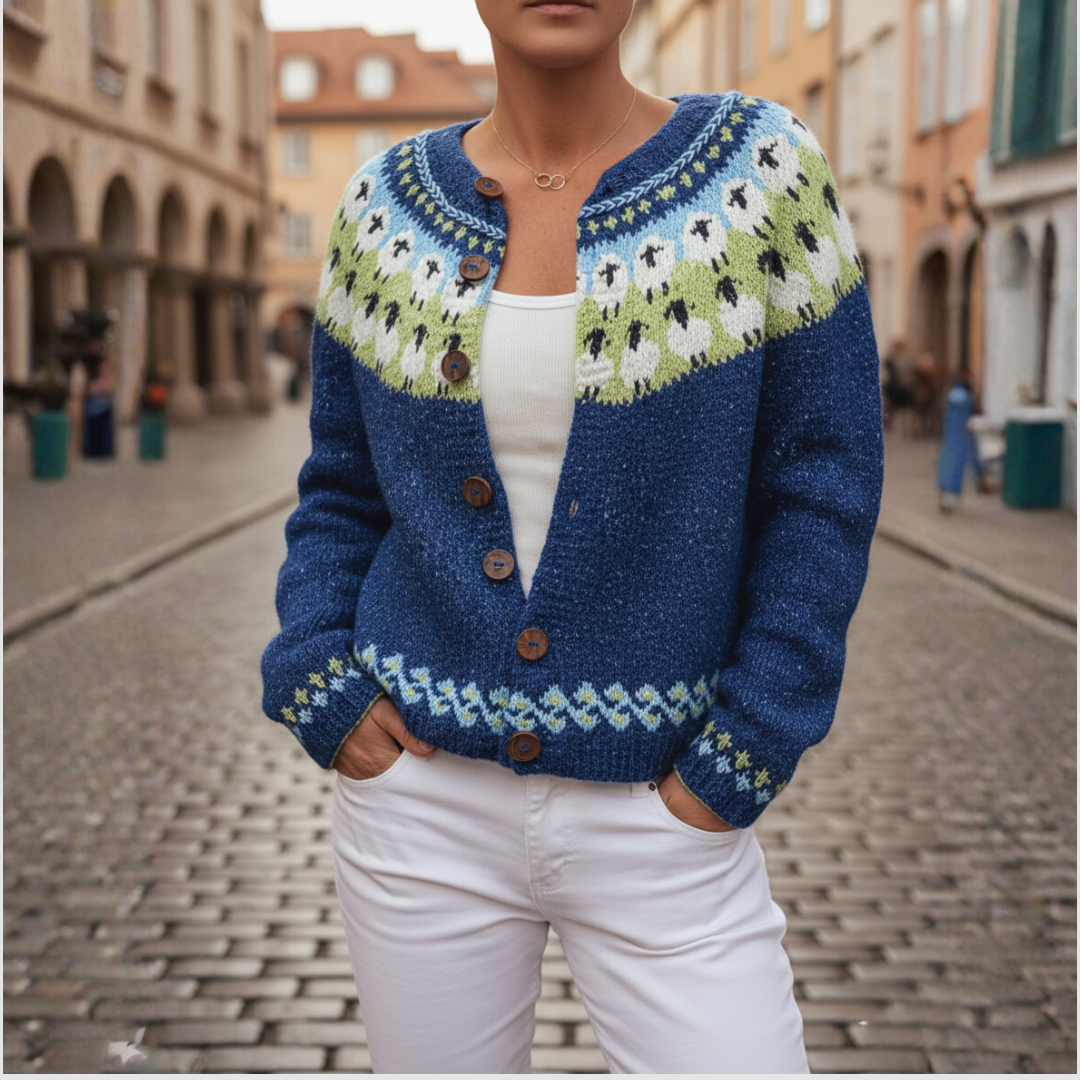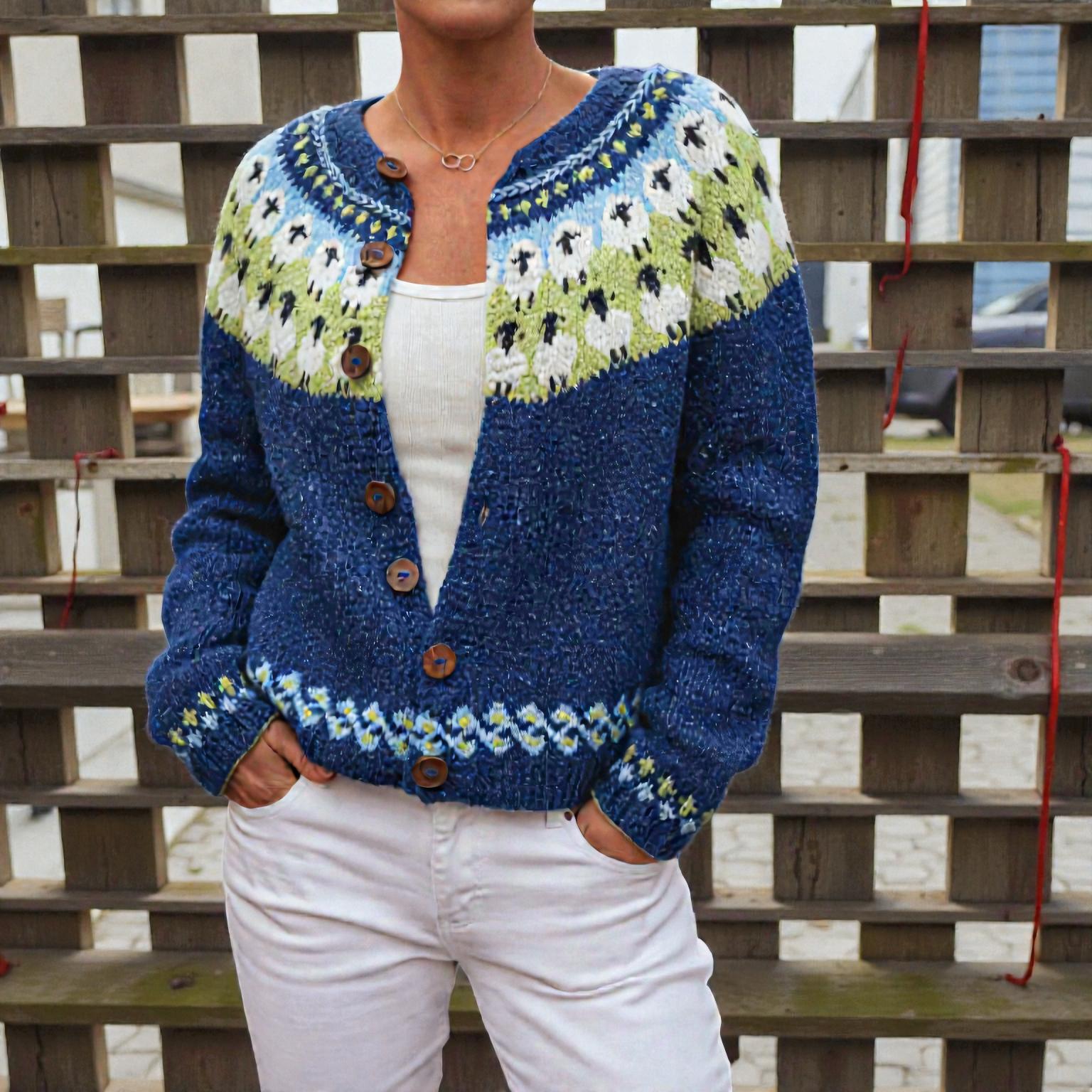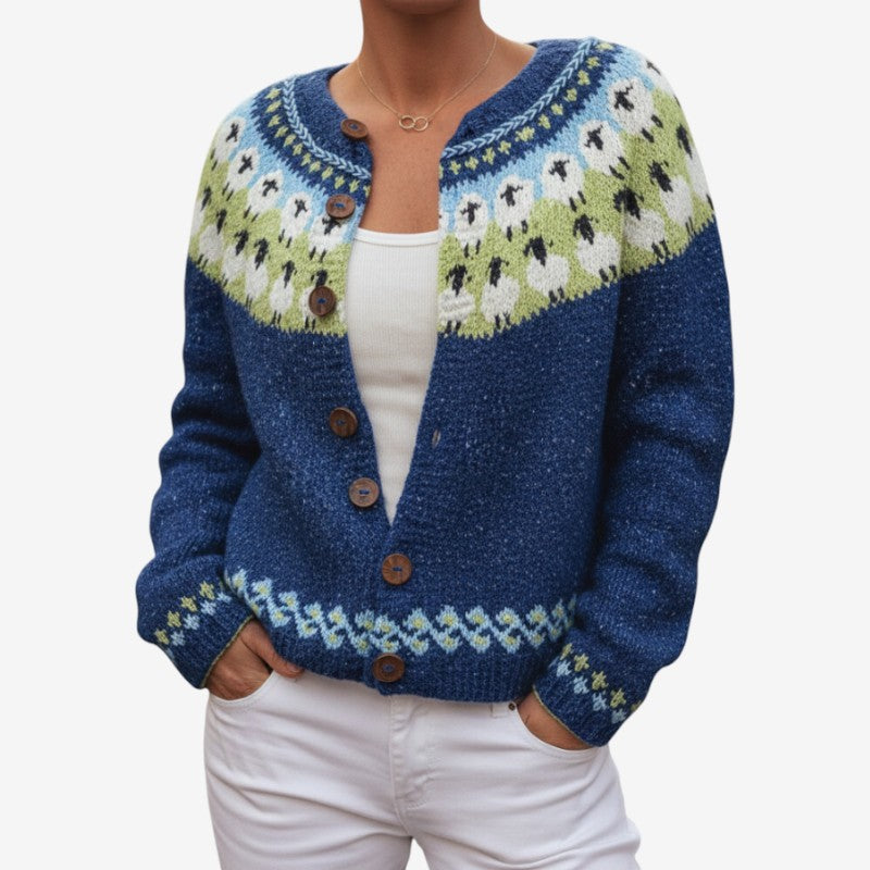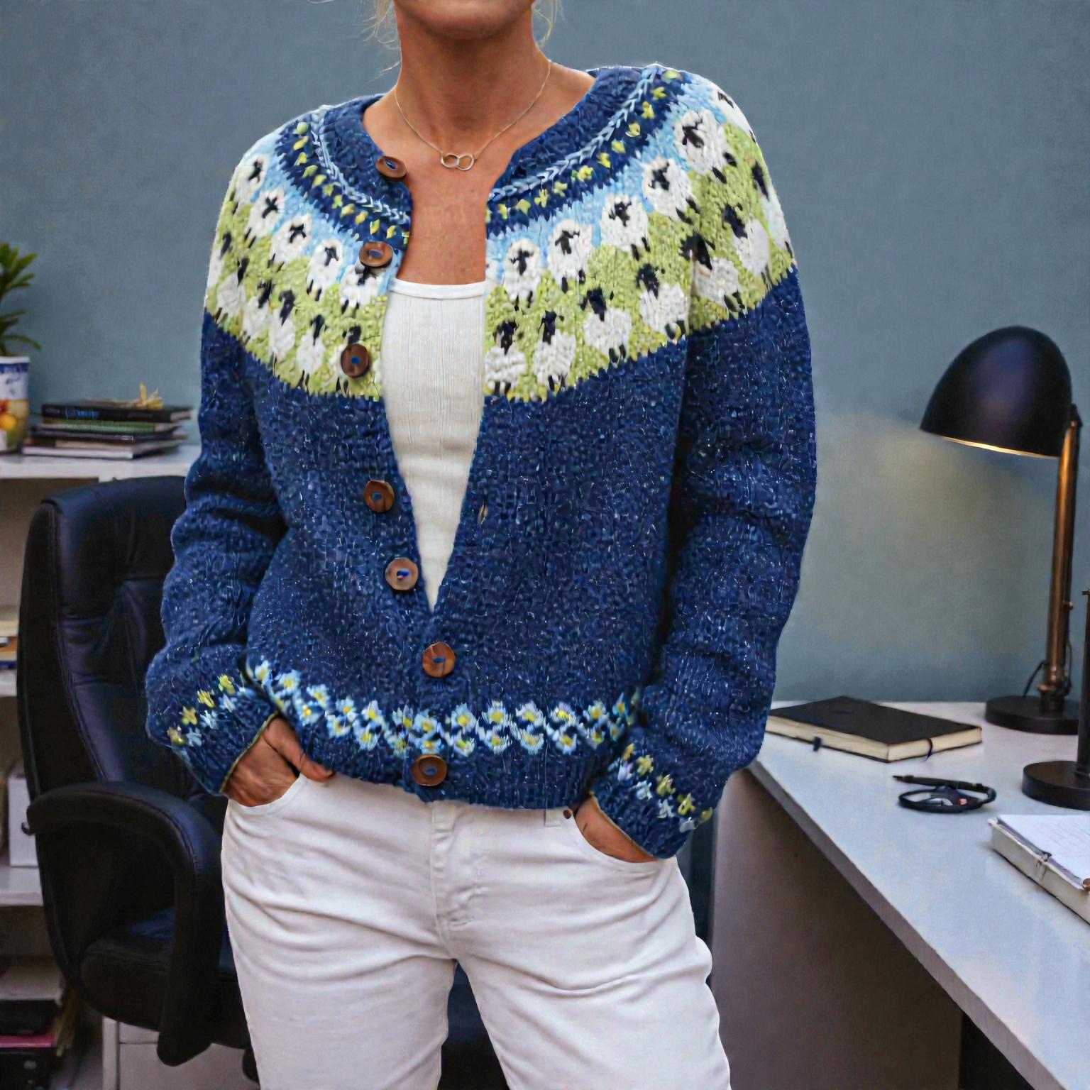 Ce cardigan à manches longues présente une fermeture à boutons et un motif nordique. La coupe droite assure une silhouette équilibrée.