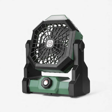 Cet appareil possède un corps compact avec un ventilateur à vitesse réglable et un éclairage LED intégré. Son design structuré permet un placement dans les tentes, les pièces ou les espaces extérieurs.
