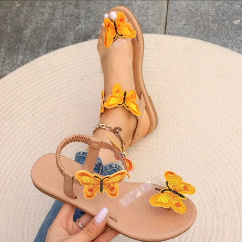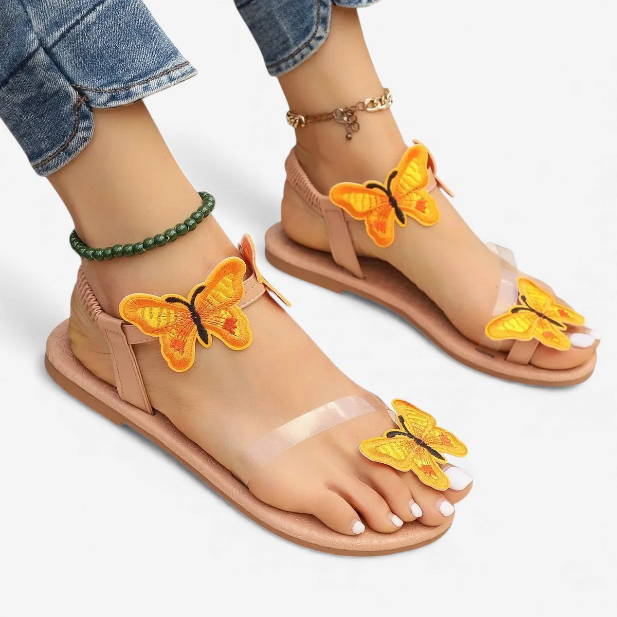 Ces sandales possèdent un bout ouvert rond et une semelle plate avec une bride à la cheville. La broderie papillon est uniformément appliquée sur toute la surface.