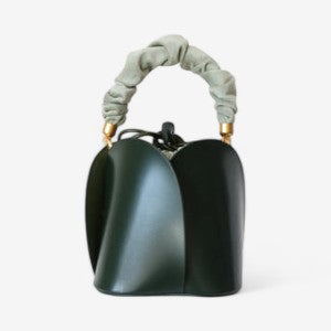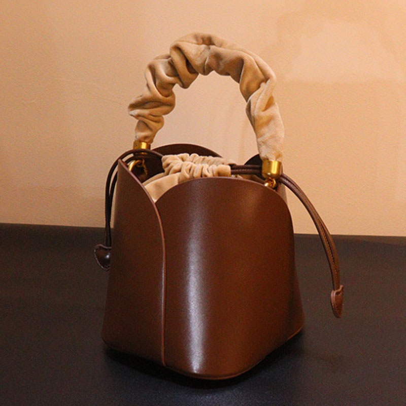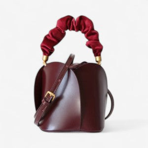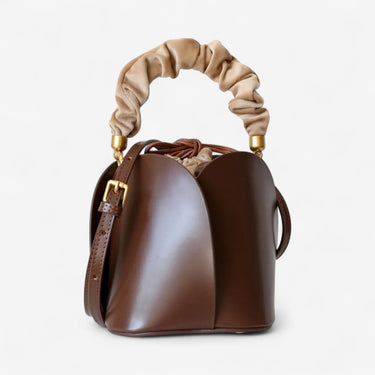 Ce sac seau présente une forme arrondie avec une bandoulière ajustable. Les panneaux sont lisses et le design conserve une forme simple et organisée.